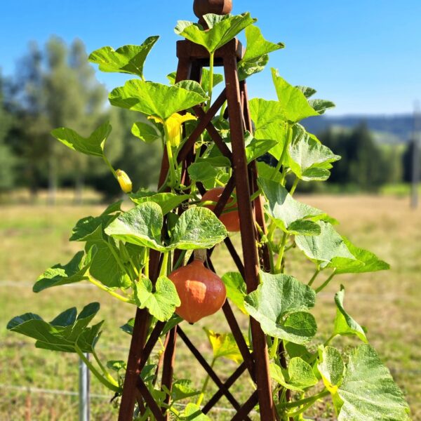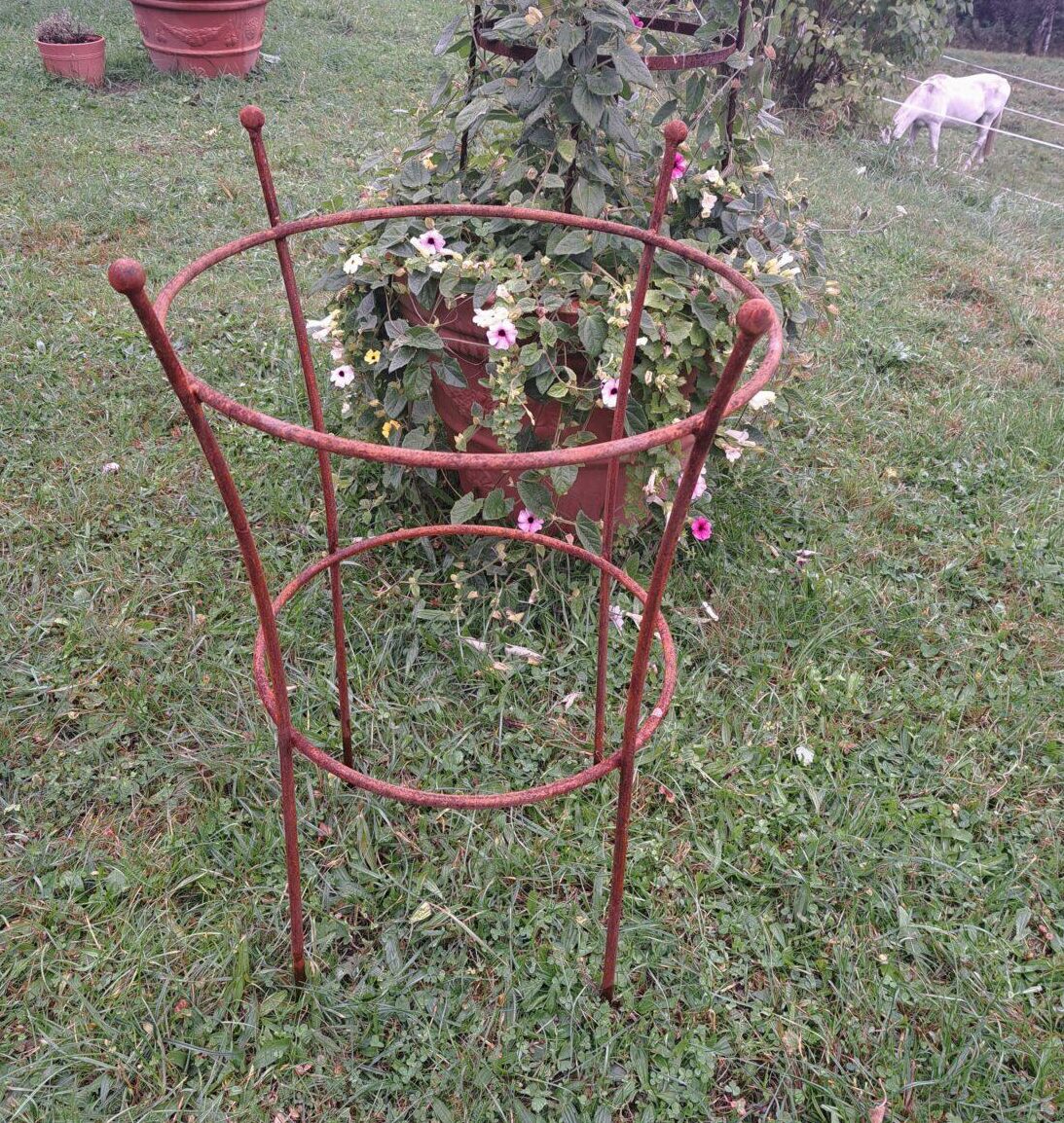 Kwietnik ręcznie wykonany ze stalowych prętów. Jak wszystkie nasze produkty pokryty jest naturalną rdzą.